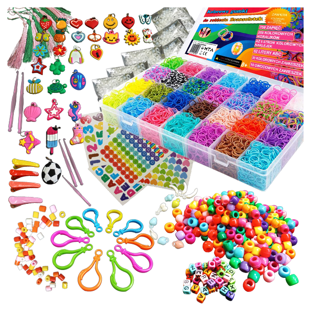• Zestaw zapakowany jest w praktyczny kuferek/organizer z przegródkami, który idealnie sprawdza się do przechowywania małych elementów. Oprócz olbrzymiej ilości kolorowych gumek znajdziemy w niej mnóstwo dodatkowych narzędzi i akcesoriów do wyplatania.