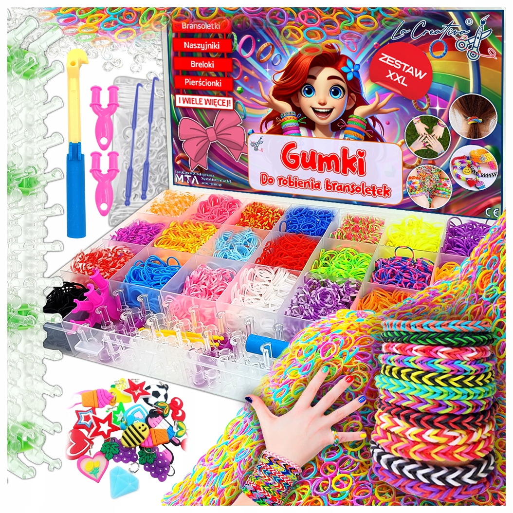 Czy zestaw nadaje się dla początkujących dzieci? ✅Tak, zestaw jest idealny również dla dzieci, które nigdy wcześniej nie robiły bransoletek. Dzięki dołączonym akcesoriom – procą, krosnu i szydełkom – dziecko krok po kroku nauczy się prostych i bardziej złożonych technik. W zestawie znajduje się również szczegółowa, obrazkowa instrukcja obsługi :) Czy gumki są bezpieczne i nietoksyczne? ✅Tak, wszystkie elementy zestawu wykonane są z materiałów posiadających certyfikaty CE i RoHS, co oznacza, że są wolne od substancji szkodliwych i bezpieczne w użytkowaniu przez dzieci. Jak długo wystarczy taki zestaw? ✅Przy rozsądnym użytkowaniu i tworzeniu do 10 bransoletek dziennie, zestaw wystarczy nawet na kilka miesięcy zabawy. Dzięki dużej liczbie gumek (ok. 12000 sztuk) można tworzyć wiele projektów bez konieczności dokupywania dodatkowych materiałów. Czy zestaw nadaje się na prezent? ✅Zdecydowanie tak! Kuferek z przegródkami, bogata zawartość i kolorowe elementy sprawiają, że jest to doskonały prezent na każdą okazję – urodziny, święta czy Dzień Dziecka.