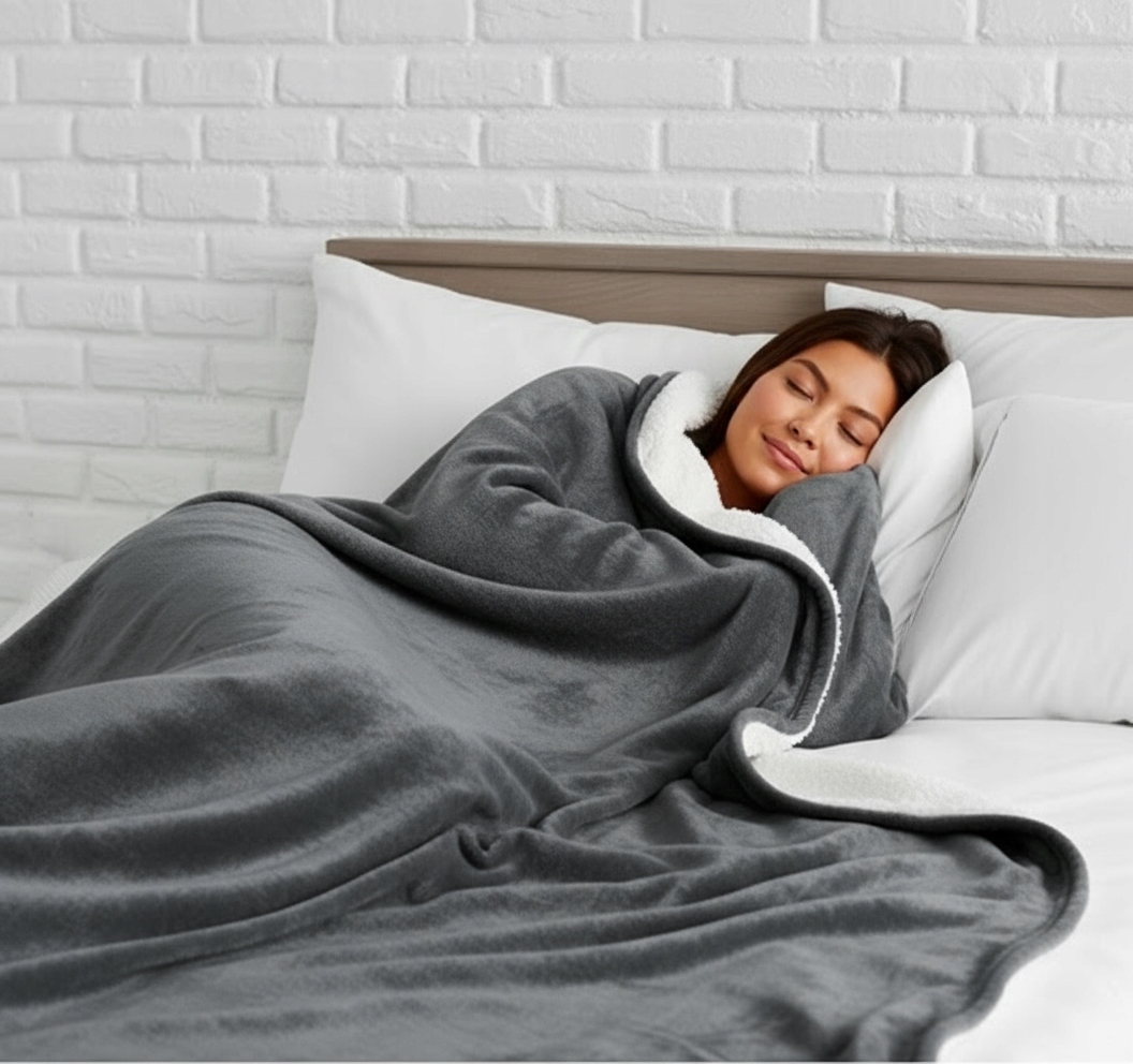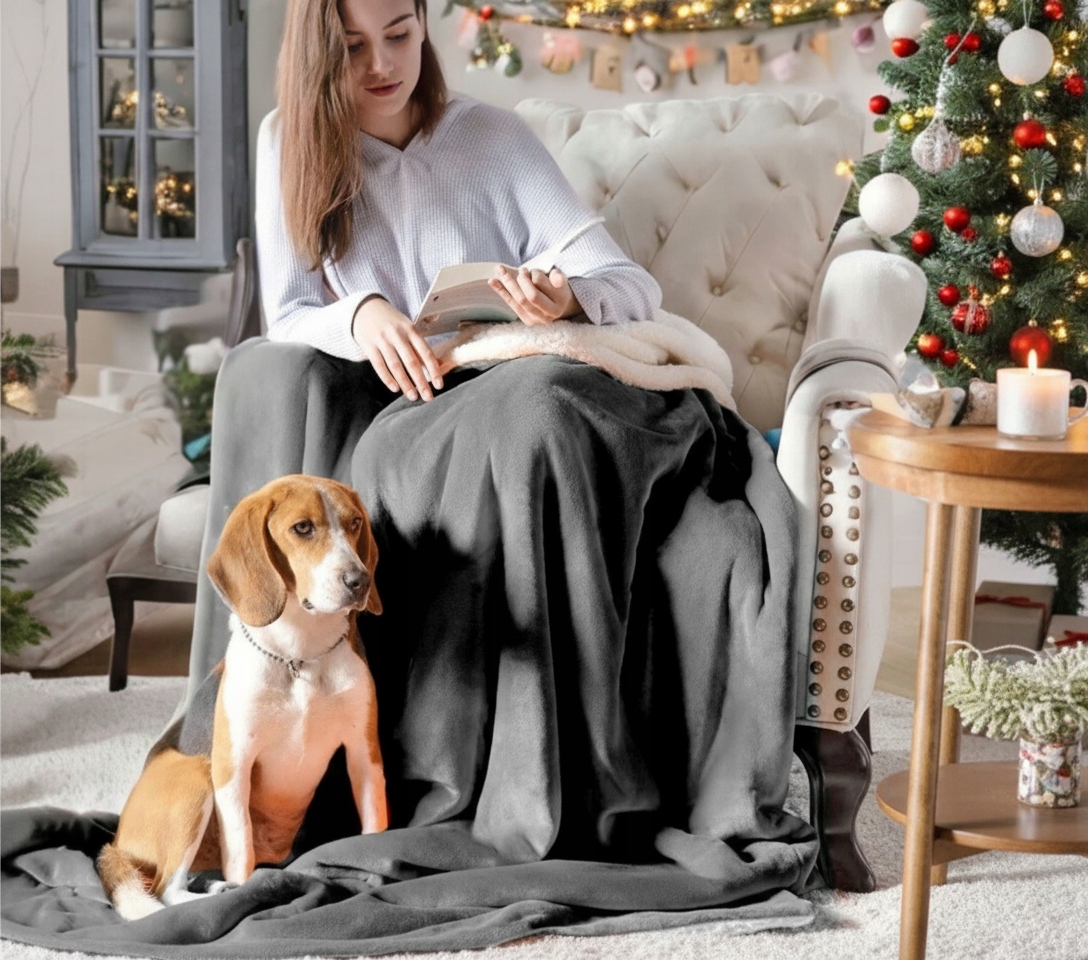 ✅Dwustronna konstrukcja – miękka mikroflanela oraz puszysty baranek sherpa w jednym produkcie