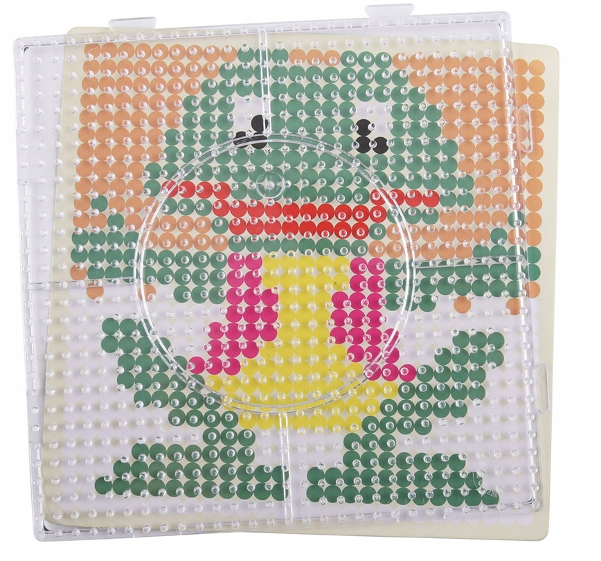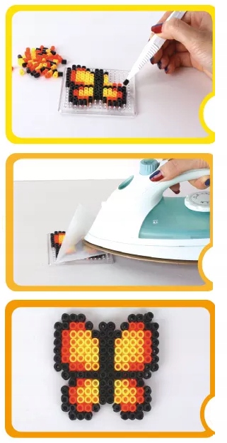 - Przyprasuj wzór przez kilka sekund ciepłym aż do momentu stopiena się koralików w jedną całość.