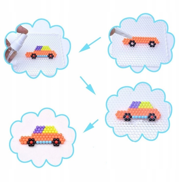 • Ułóż dowolny kształt, spryskaj wodą i parz jak w magiczny sposób koraliki łączą się ze sobą! I to wszystko bez użycia kleju! Sprawdź sam!