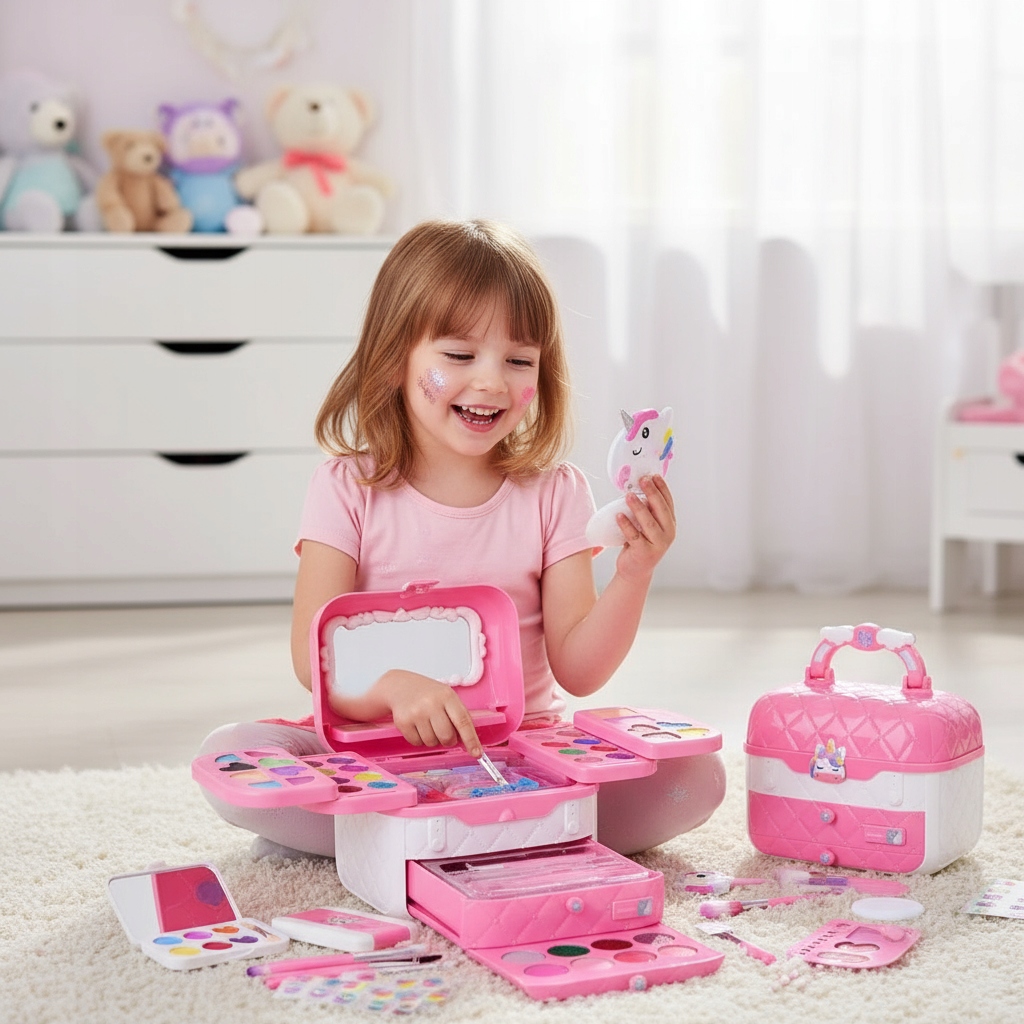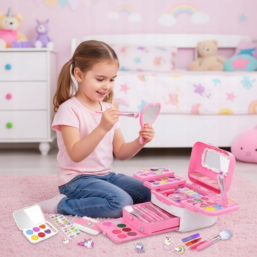 ✅ Bezpieczne kosmetyki odpowiednie dla dzieci już od 3. roku życia ✅ Bogaty wybór kolorów i akcesoriów do makijażu i paznokci ✅ Łatwe zmywanie kosmetyków tylko wodą – bez środków chemicznych ✅ Piękny, rozkładany kuferek z lusterkiem – idealny na prezent ✅ Zabawa rozwijająca kreatywność, precyzję i poczucie estetyki