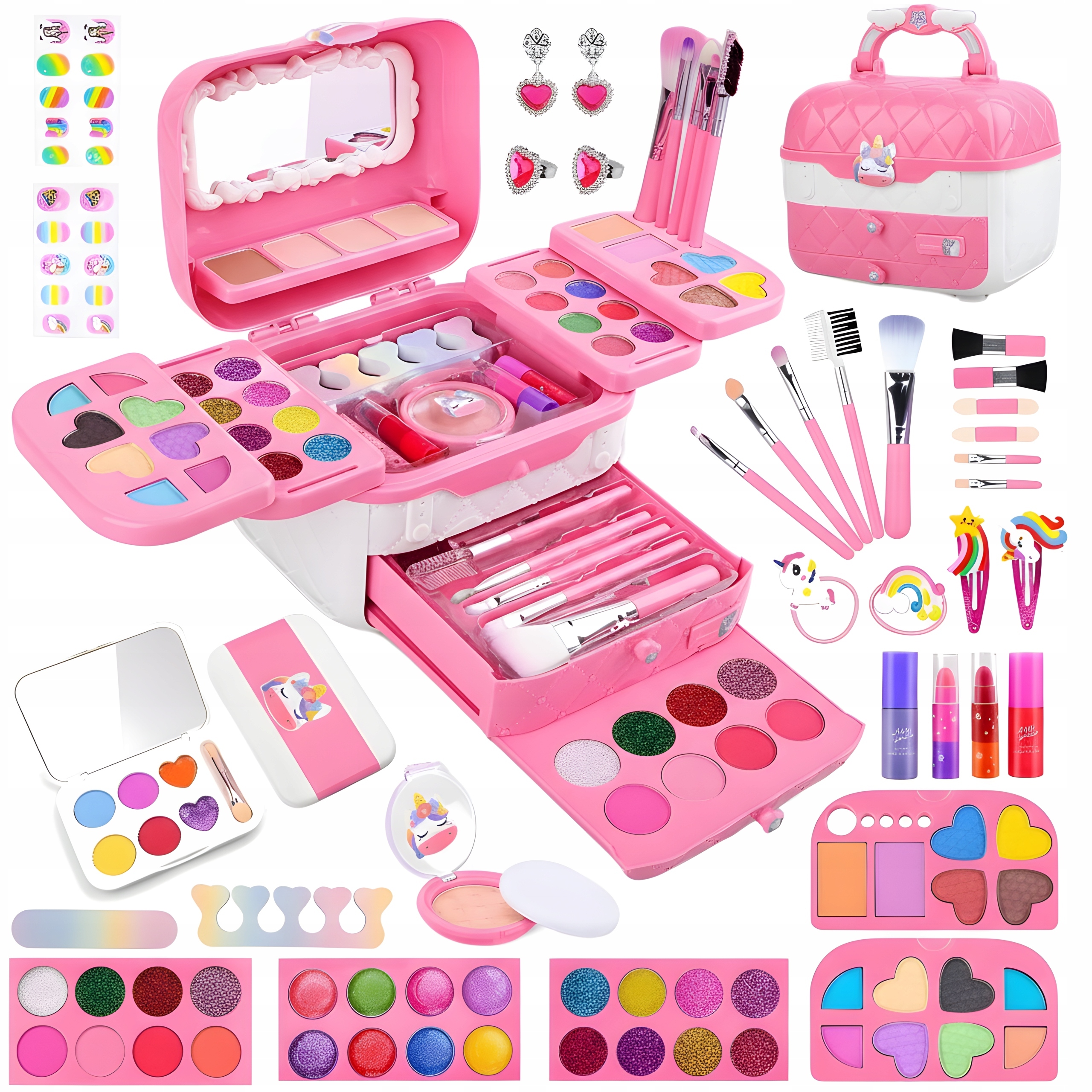 ➡️ Kuferek z lusterkiem i szufladkami ➡️ 14 prasowanych cieni do powiek ➡️ 12 brokatowych cieni do powiek ➡️ Paletka z 6 cieniami i pędzelkiem z motywem jednorożca ➡️ 8 błyszczyków ➡️ 4 róże ➡️ 4 bronzery i pudry ➡️ Puder prasowany z puszkiem ➡️ 2 podwójne pomadki ➡️ 5 pędzli do makijażu ➡️ 2 pędzle do różu ➡️ 2 aplikatory dwustronne ➡️ 2 pędzle do ust ➡️ 12 naklejek na paznokcie ➡️ 2 lakiery do paznokci ➡️ Pilniczek ➡️ Separator ➡️ 2 gumki i 2 spinki do włosów ➡️ Komplet kolczyków i 2 pierścionki