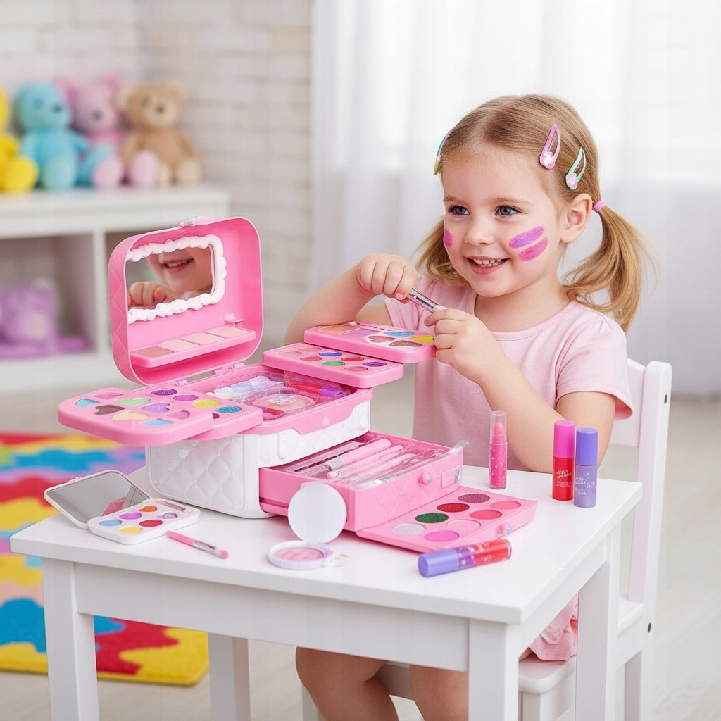 ✅ Bezpieczne kosmetyki odpowiednie dla dzieci już od 3. roku życia ✅ Bogaty wybór kolorów i akcesoriów do makijażu i paznokci ✅ Łatwe zmywanie kosmetyków tylko wodą – bez środków chemicznych ✅ Piękny, rozkładany kuferek z lusterkiem – idealny na prezent ✅ Zabawa rozwijająca kreatywność, precyzję i poczucie estetyki