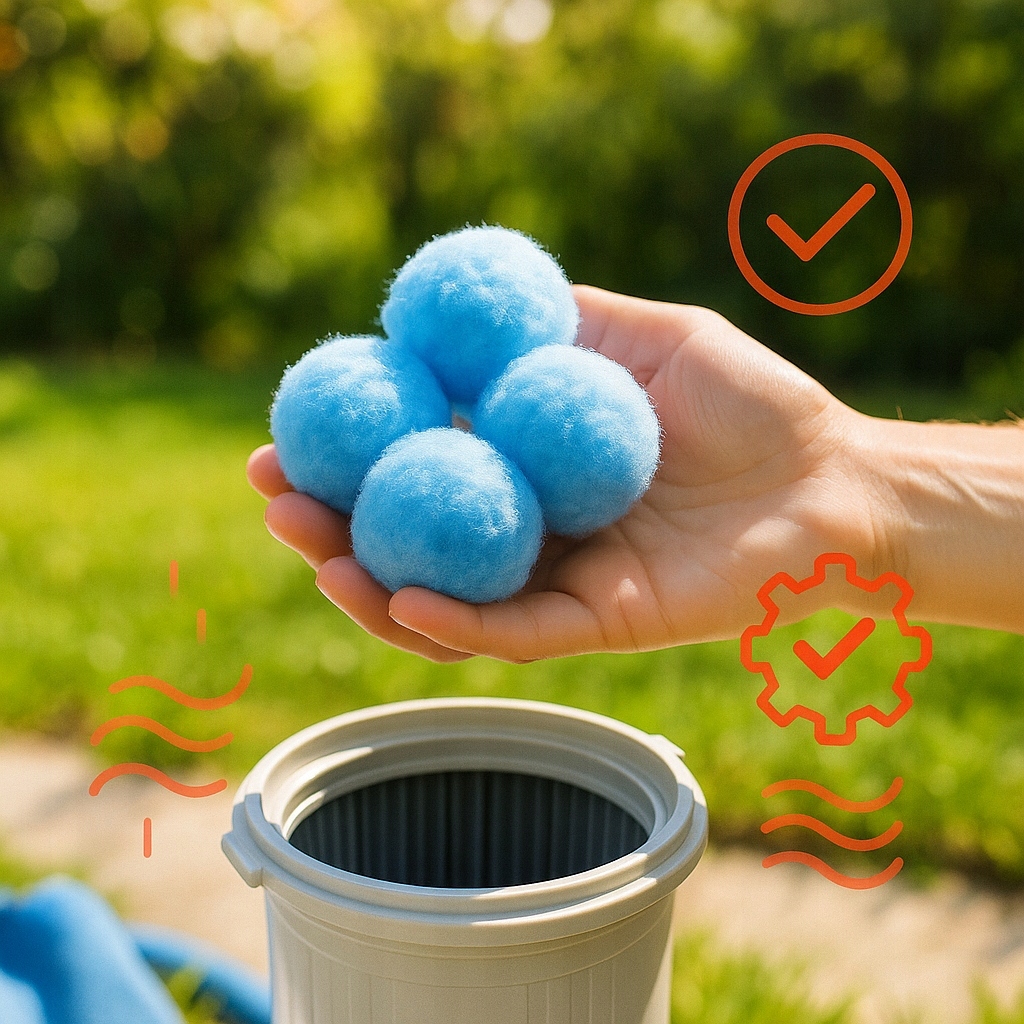 - ➡️ Po zakończeniu sezonu lub gdy filtracja jest mniej efektywna – wyjmij kulki i przepłucz je pod wodą lub wypierz.