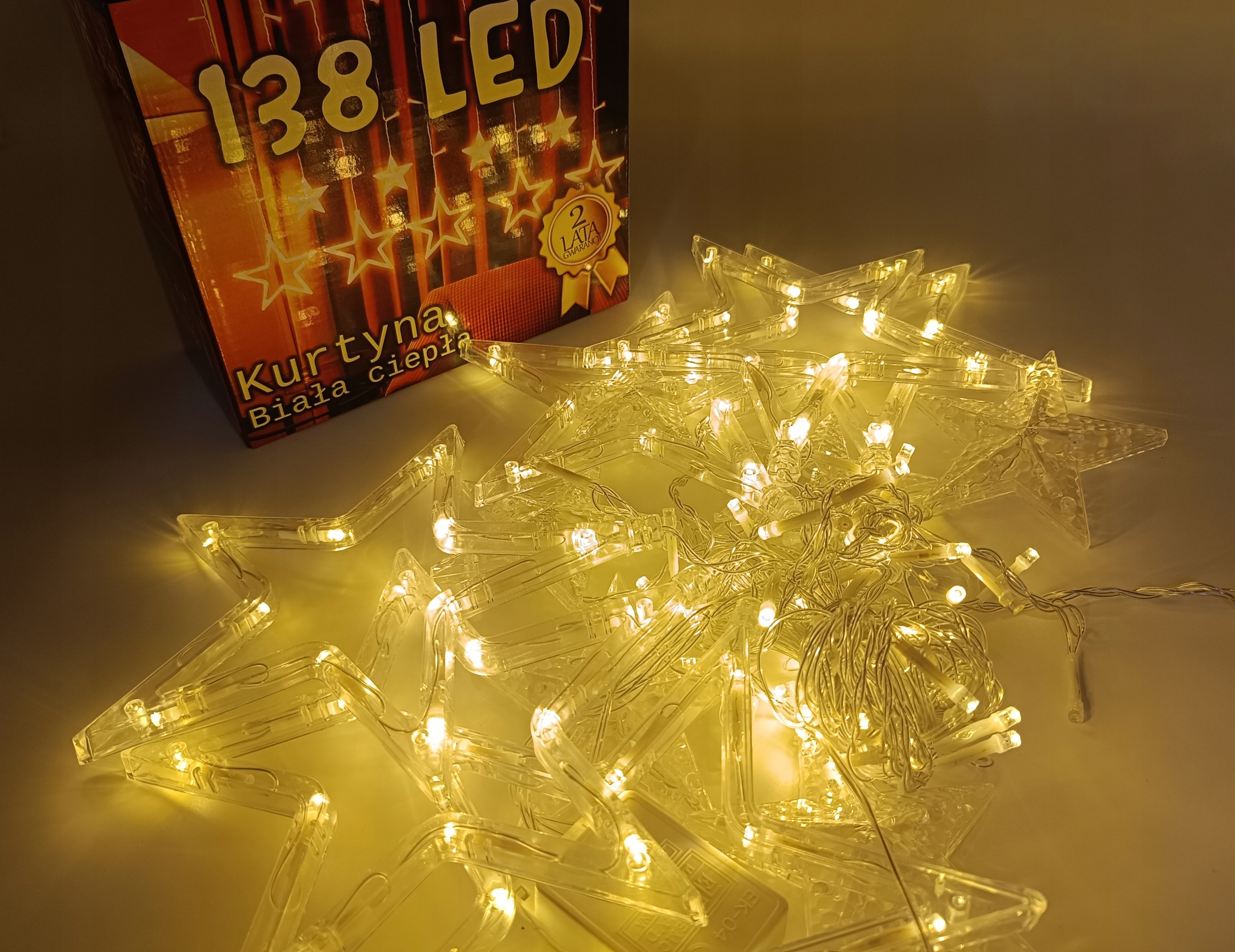 KURTYNA ŚWIETLNA LED LAMPKI GWIAZDKI CIEPŁE BIAŁE CHOINKOWE GIRLANDA OKNO