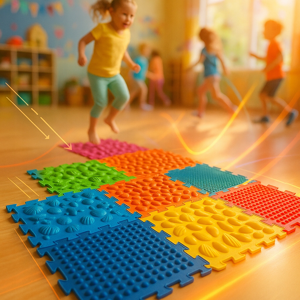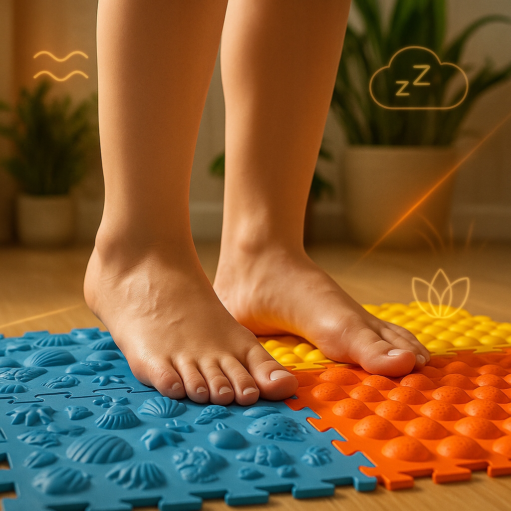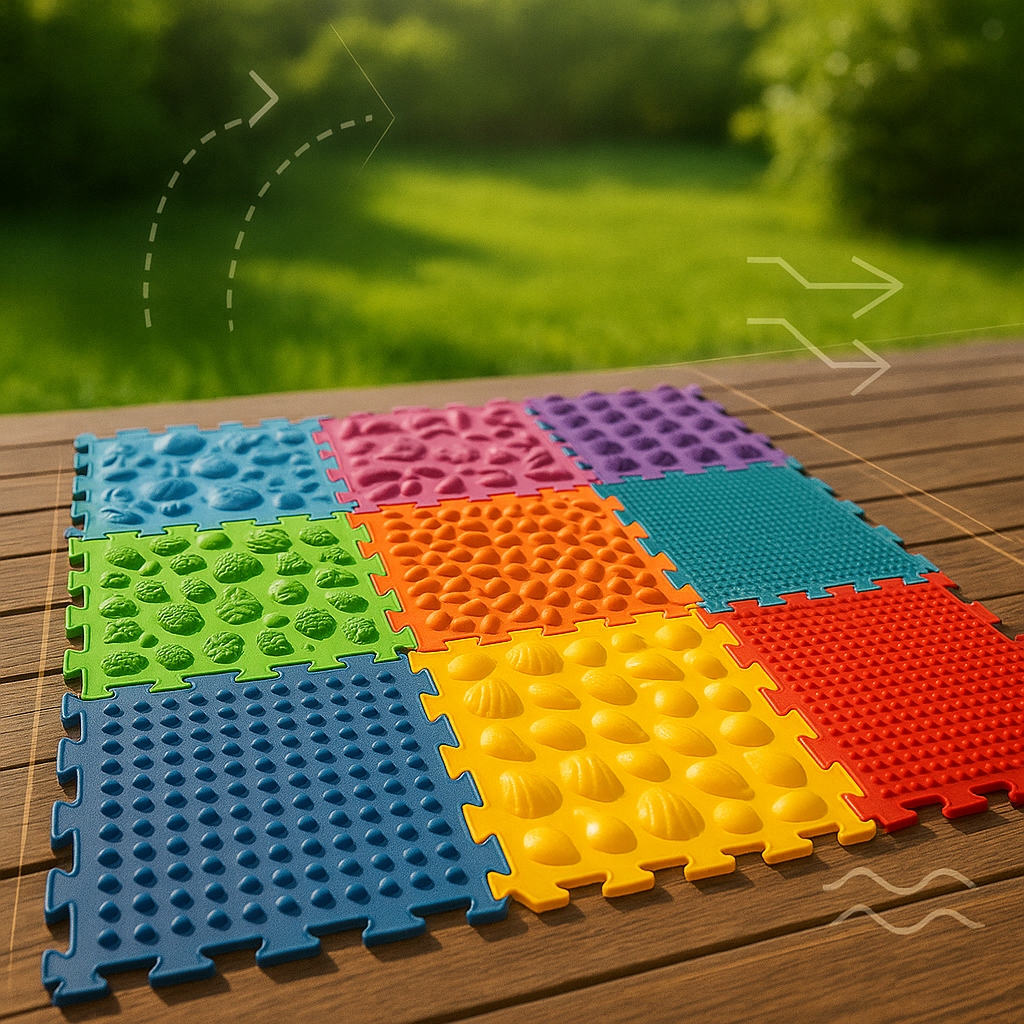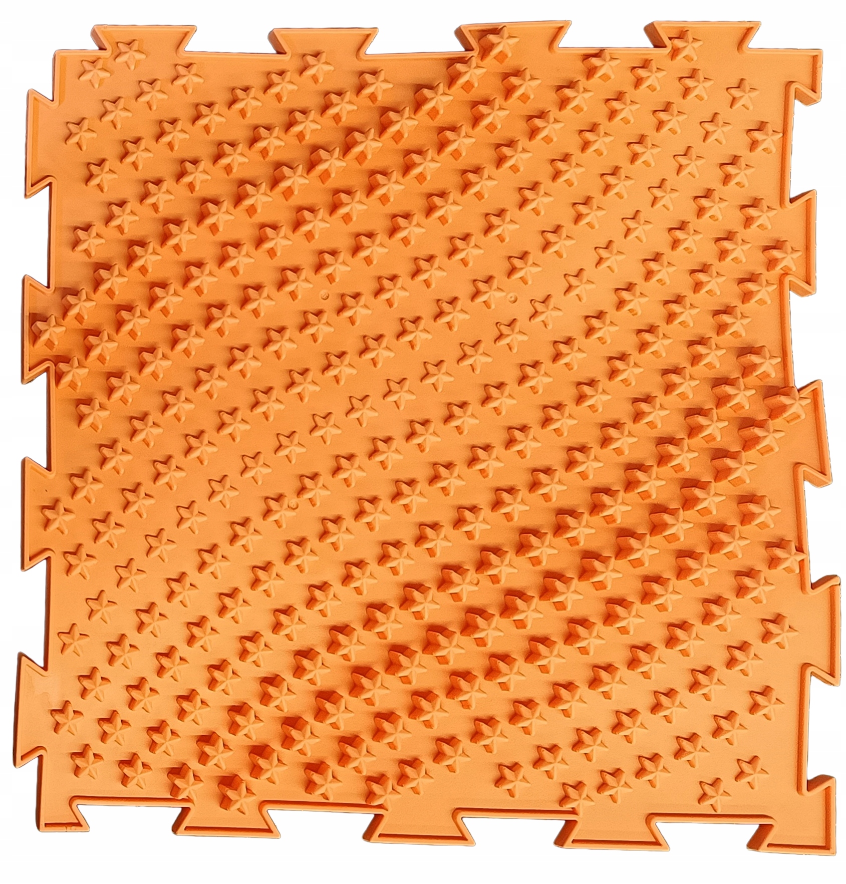 Rozłóż puzzle na płaskiej powierzchni. Połącz elementy w dowolnej konfiguracji. Stań lub przejdź się po macie boso kilka minut dziennie. Zwiększaj czas korzystania stopniowo, aby wzmocnić efekty.Zalety:
