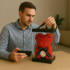 - Umieść misia w pudełku, dołącz kartkę oraz balon.