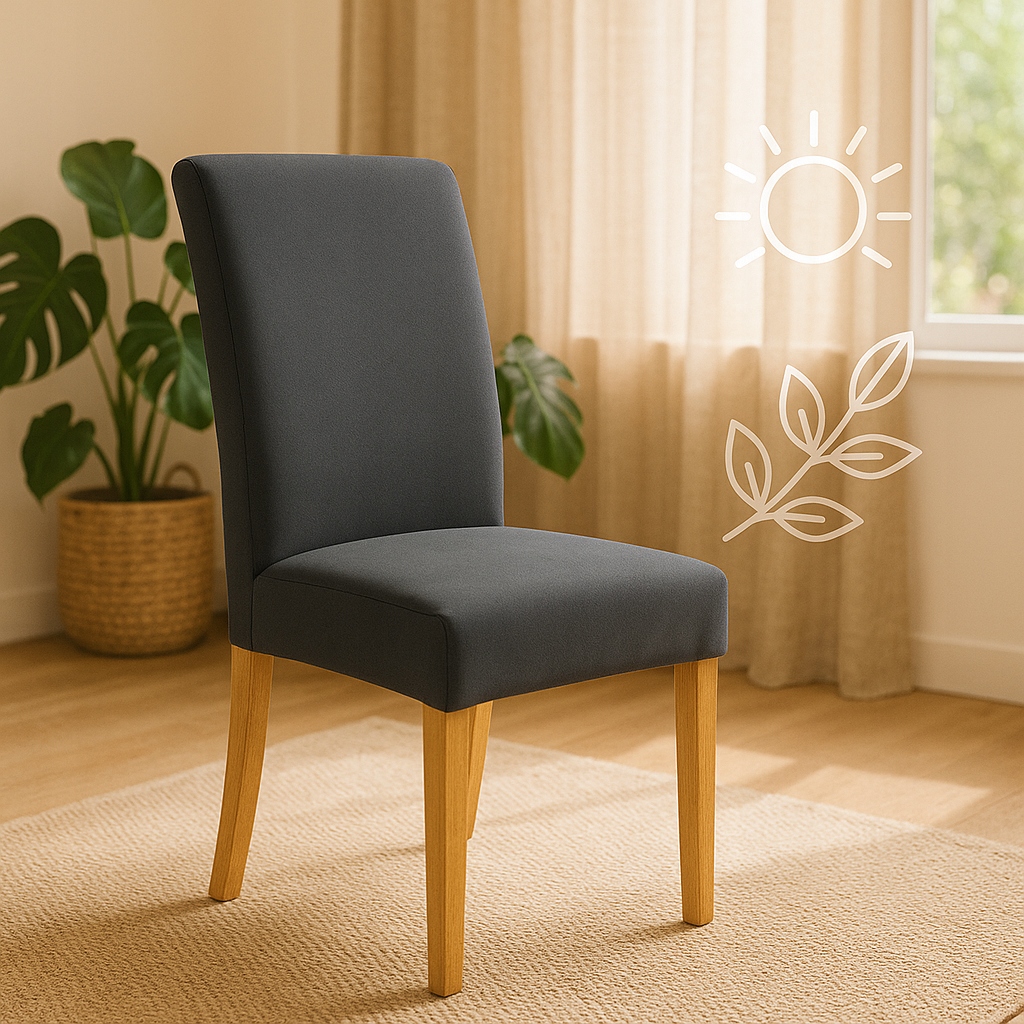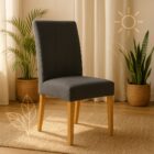 ➡️ Rozciągnij pokrowiec i umieść go na oparciu krzesła. ➡️ Dociągnij materiał równomiernie w dół. ➡️ Dopasuj do siedziska, wygładzając powierzchnię. ➡️ Dzięki wszytym gumkom pokrowiec pozostaje na miejscu. ➡️ Gotowe – możesz cieszyć się odmienionym krzesłem!