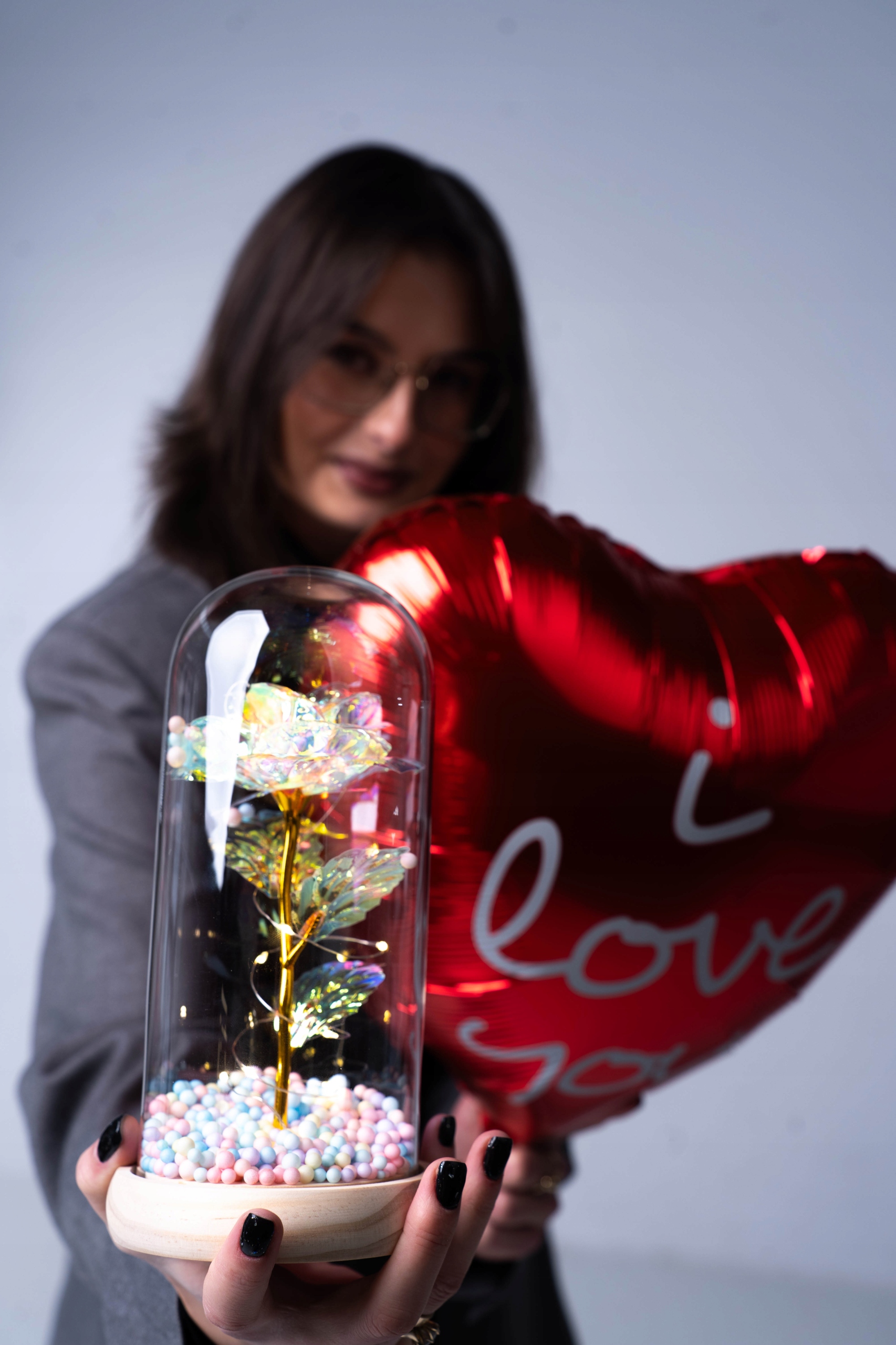 ✅Wieczna róża to nie tylko piękna dekoracja, ale także wzruszający symbol miłości, który nigdy nie więdnie. Umieszczona w transparentnej kopule z kolorowymi światełkami LED, przyciąga wzrok i tworzy magiczną atmosferę. To prezent, który mówi więcej niż słowa — idealny dla żony, dziewczyny, mamy czy babci. Balon w kształcie serca dołączony gratis dodaje jeszcze więcej romantyzmu i uroku każdemu podarunkowi. Róża w szkle to piękno i trwałość zamknięte w jednej formie.Łatwa i szybka w użyciu