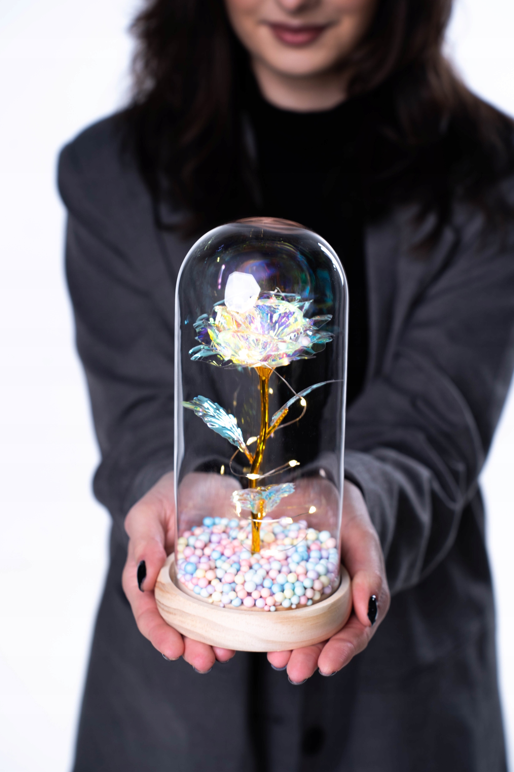 Ta dekoracja jest gotowa do użycia od razu po rozpakowaniu i nie wymaga skomplikowanego montażu. ✅Poniżej przedstawiamy krótką instrukcję obsługi Wiecznej Róży w Akrylowej Kopule LED:- Umieść produkt w wybranym miejscu (np. na półce, komodzie lub stoliku nocnym).