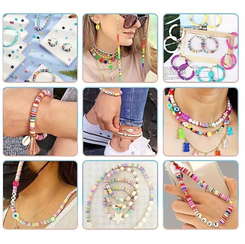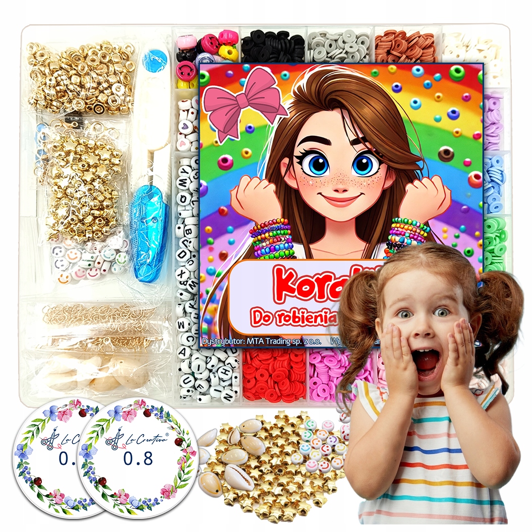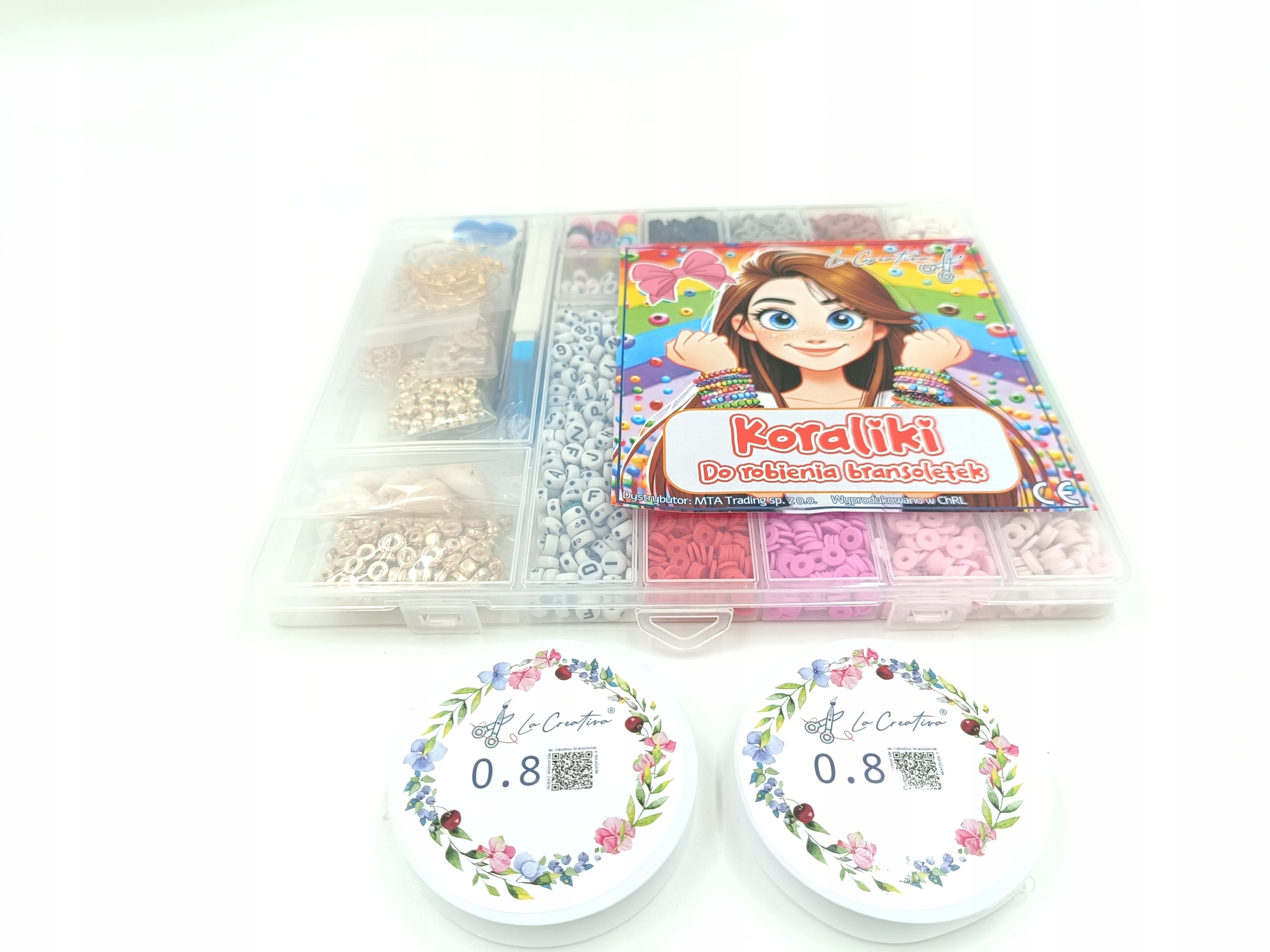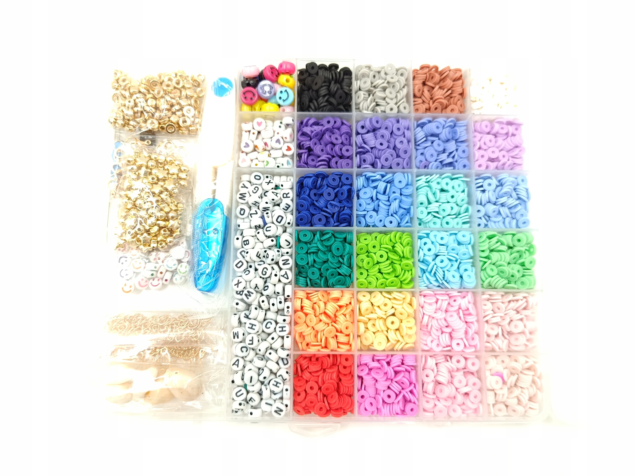 Ten niesamowity zestaw zawiera około 6000 elementów, które otwierają drzwi do świata nieograniczonej kreatywności. Zawartość zestawu została starannie dobrana, aby dostarczyć maksimum radości z tworzenia unikalnych biżuteryjnych dzieł sztuki: ✅ Płaskie koraliki w 24 idealnie wyselekcjonowanych kolorachSilikonowa gumka na szpuli (bezbarwna) – 2 szt ✅ Złote zawieszki charms – 8 szt ✅ Zawieszki muszelki – 5 szt ✅ Kolorowe i przezroczyste koraliki z uśmiechami – 20 szt ✅ Koraliki z kolorowymi uśmiechami i serduszkami – 50 szt ✅ Koraliki z literkami (mix) – 200 szt ✅ Złote dodatki – gwiazdki, kwadraciki, kółka, kulki – 150 szt ✅ Złote łańcuszki i zestaw do kolczykówZapięcia – 10 szt ✅ Zapięcia typu homar – 30 szt ✅ Ogniwa – 50 szt ✅ Pęseta, nożyczki i organizer z 28 przegródkami